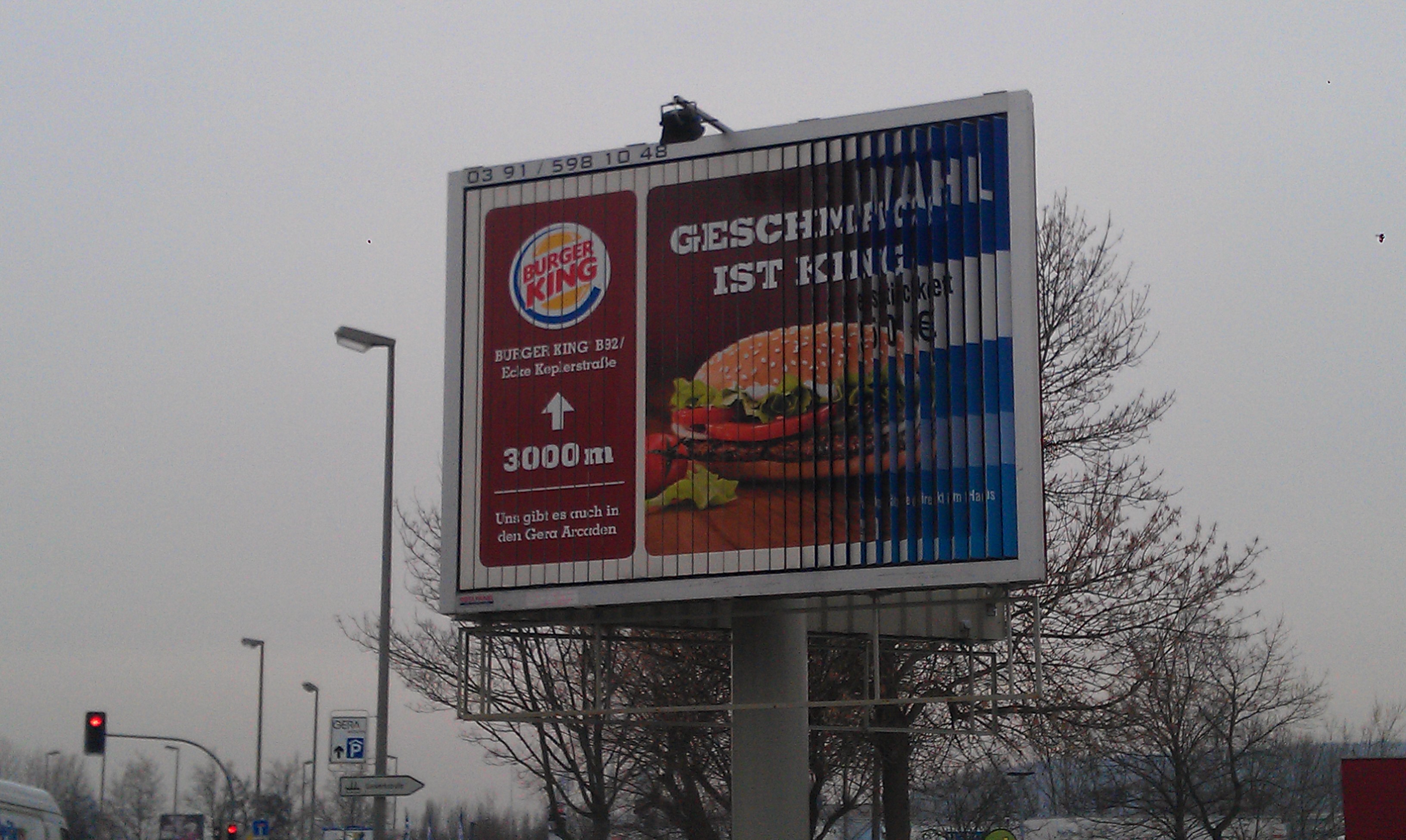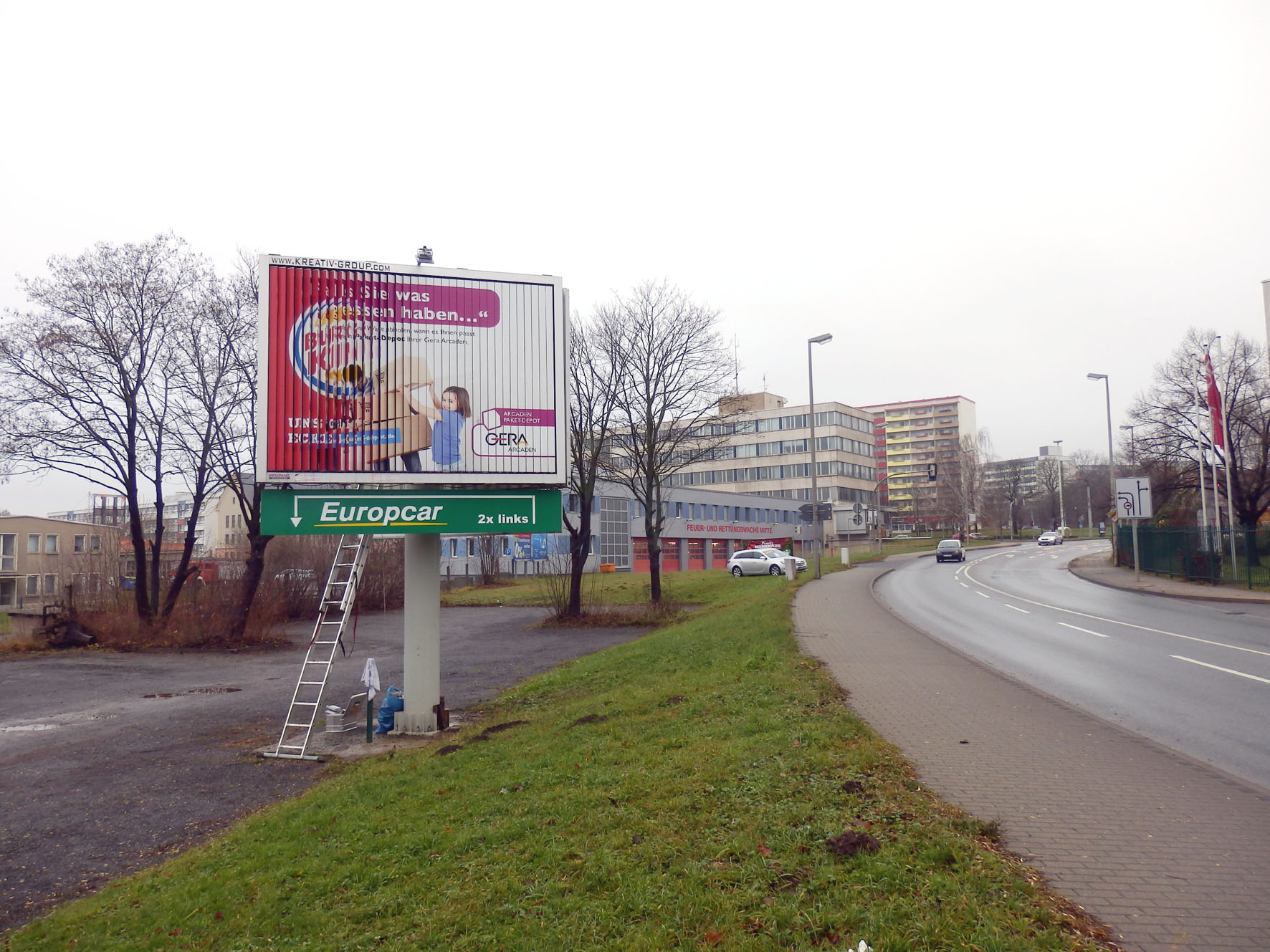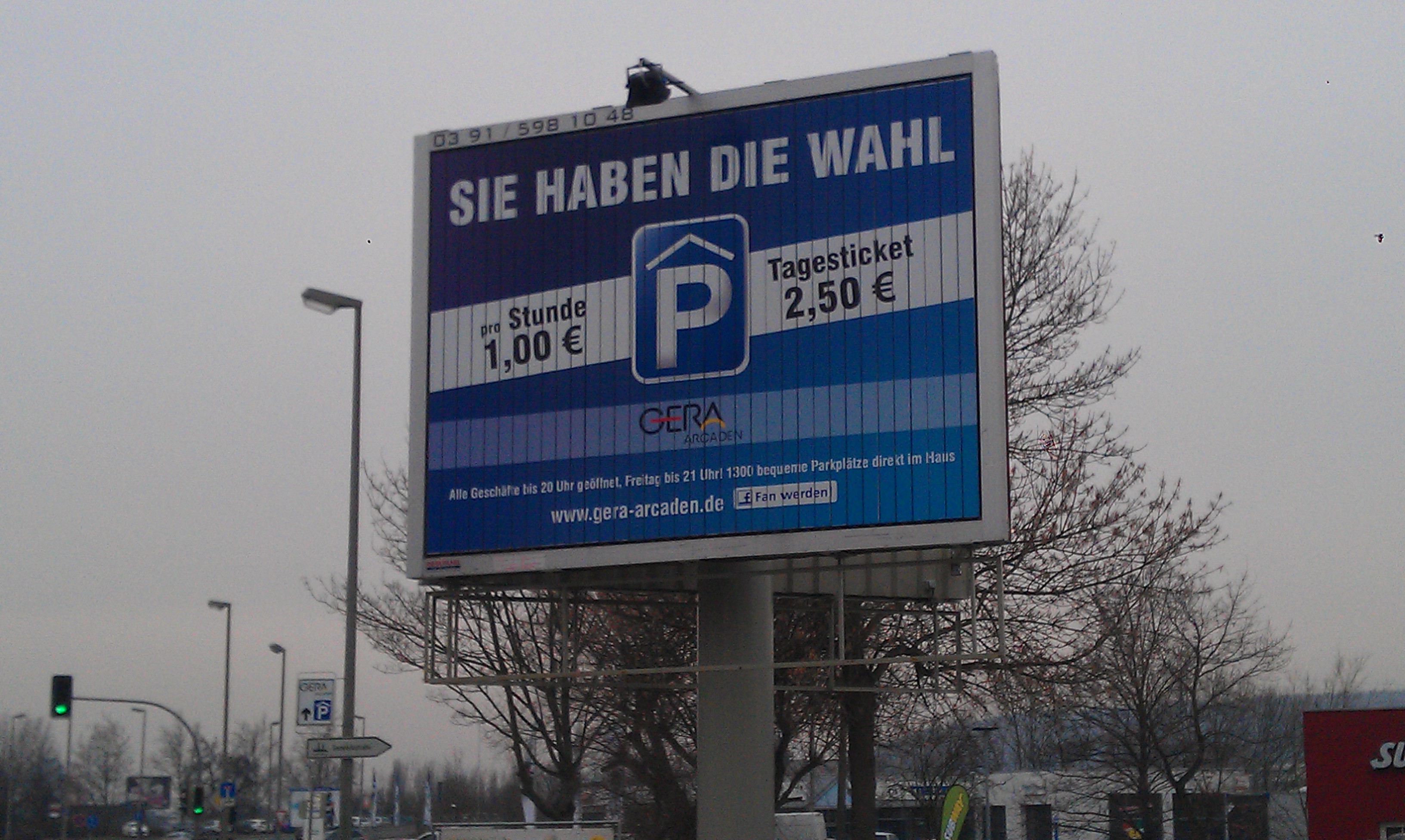 (Zur Galerieansicht Bild anklicken) | | | Standort: | | direkt in der City von Gera Theaterstrasse Kreuzung Berliner Strasse - zwischen den beiden Ampelanlagen Berliner-Strasse und Gaswerkstrasse - 3 Meter neben der B2 - zwischen Feuerwehr und Subway gegenüber der AOK in Richtung Süden | | Abmessungen: | | 4,00 x 3,00 Meter | | Kontaktchancen: | | ca. 70.000 täglich | | Besonderheiten: | | Anlage mit Beleuchtung! | | Kartenansicht: | | |